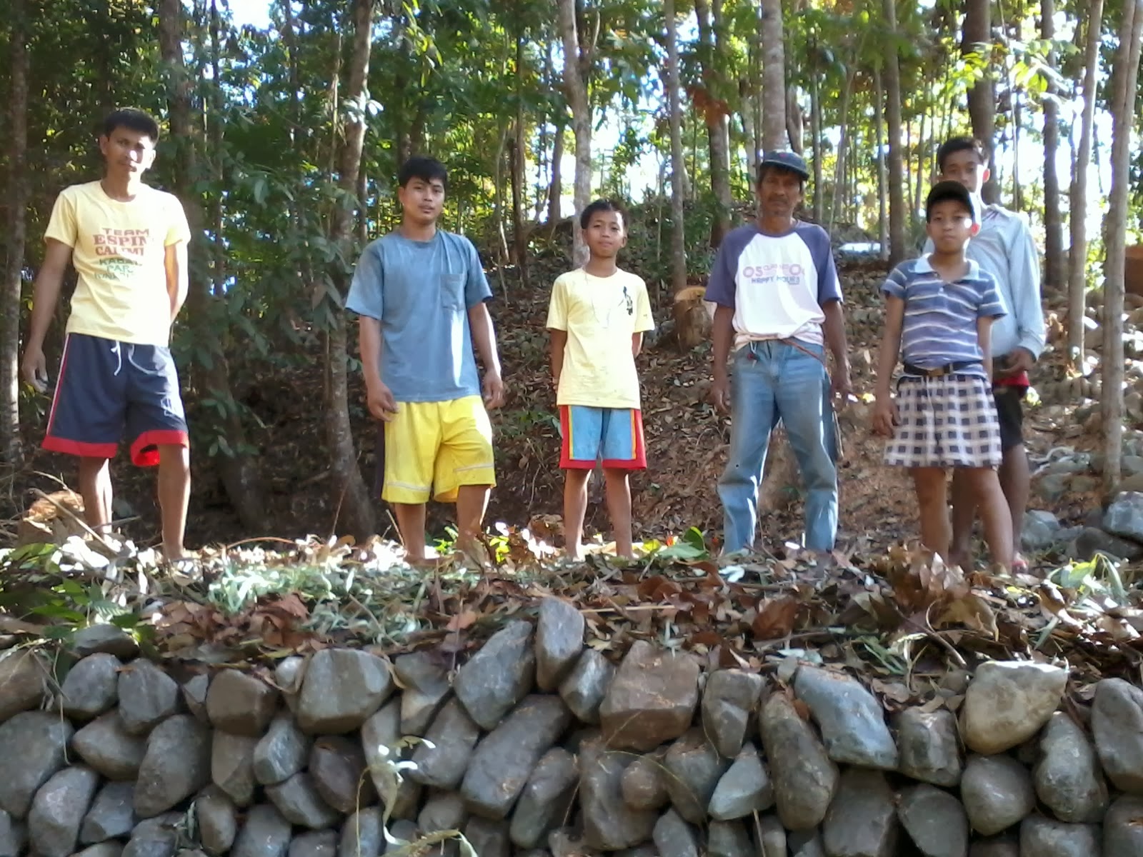 Our caretakers, Danny (left most) and his father, Nong Endring Paragas (4th from left). Yesterday, I hired two extra laborers, Boknoy (2nd from left) and a son of Kagawad Mandy (right most). His two younger brothers joined briefly in gathering dried leaves as filling materials behind the rock wall.